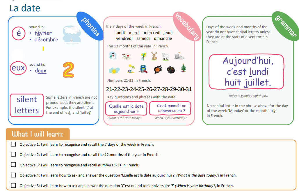 As linguists, children will learn how to ask and say the date in French using days of the week and months of the year.